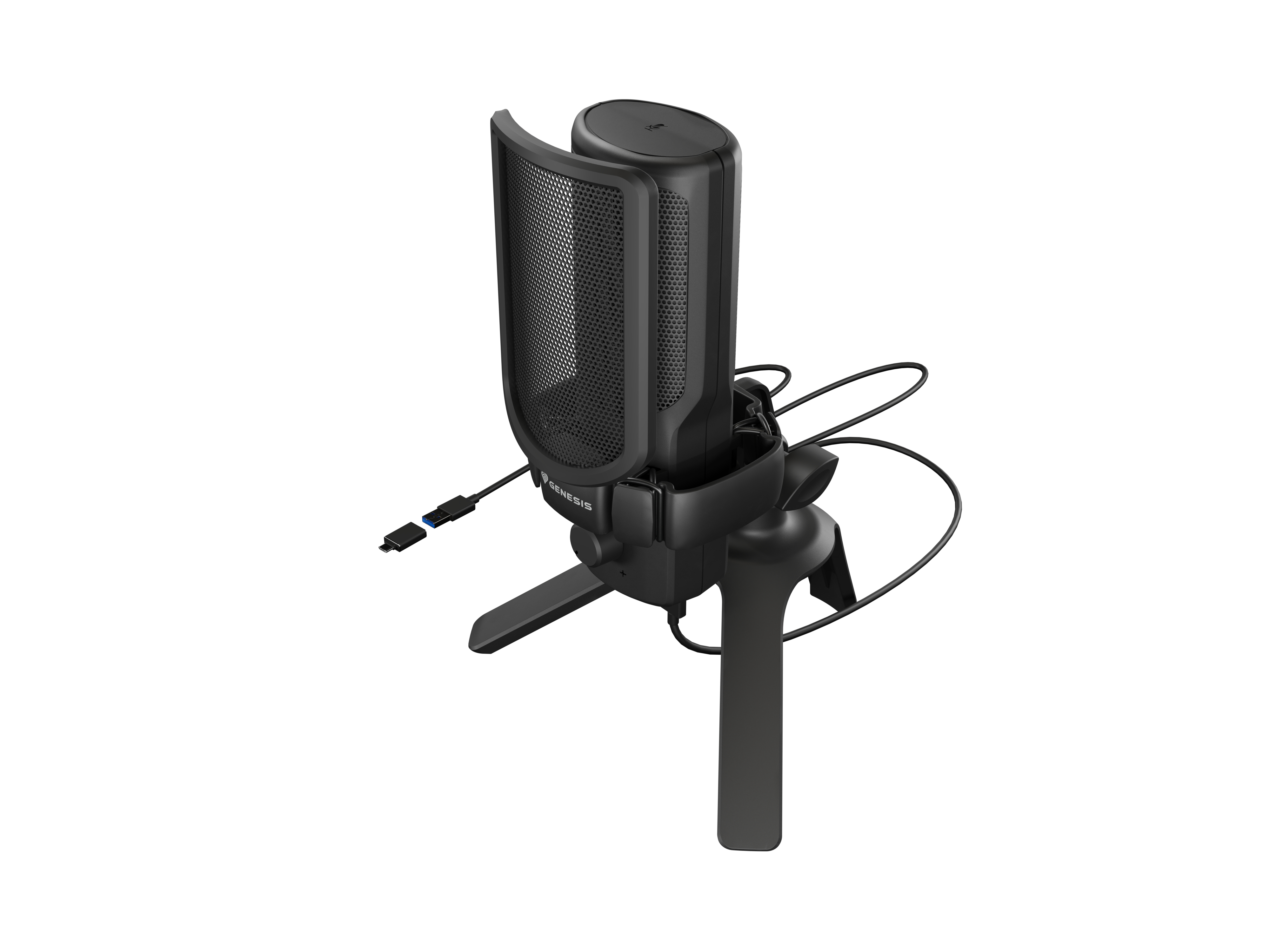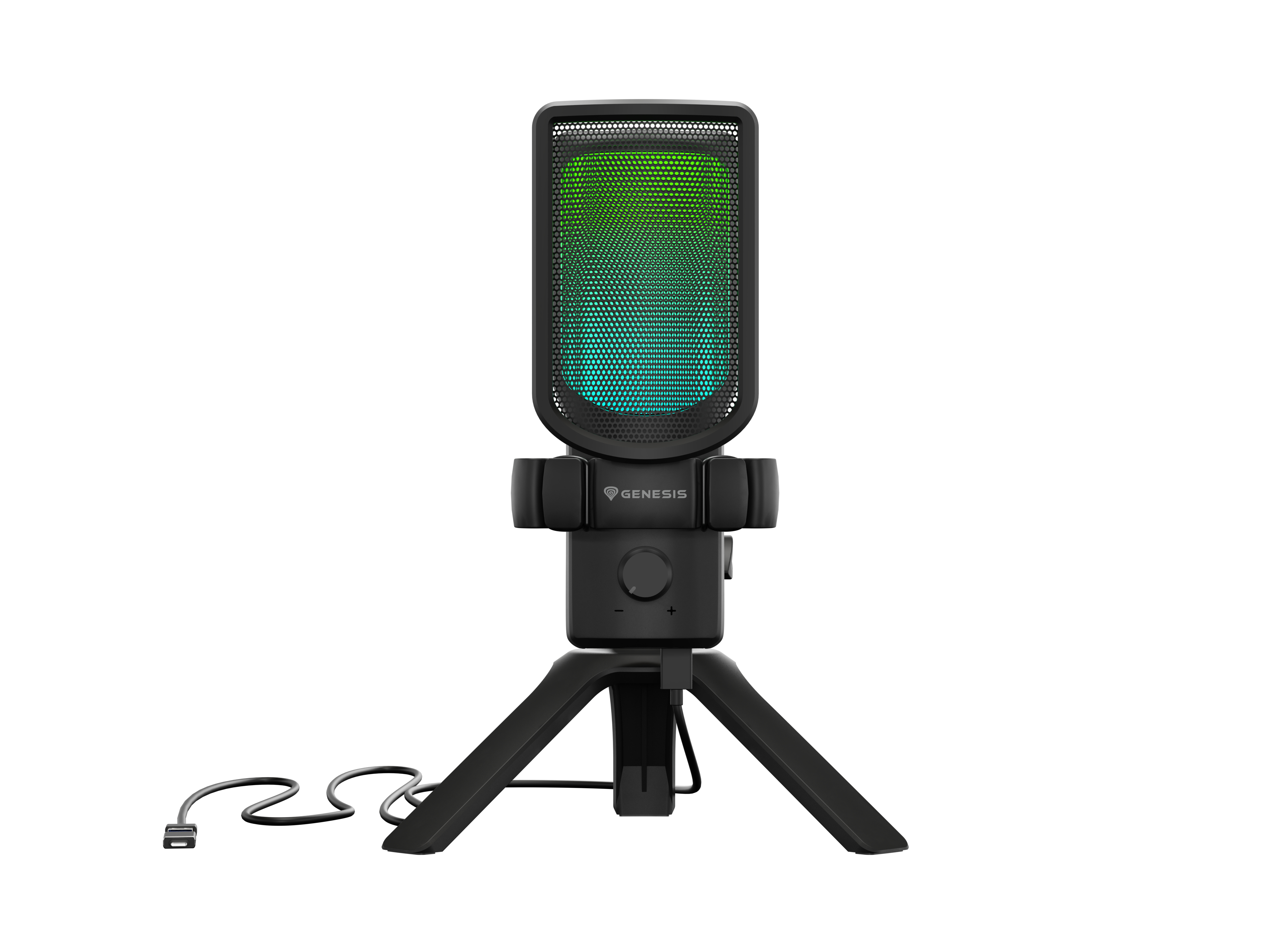 Genesis Radium 250 USB microfoon, USB-plug-and-play condensator, cardioïde karakteristiek, ingebouwde gain-knop, real-time headphone-monitoring, RGB verlichting, desk-stand inbegrepen, kleur Zwart